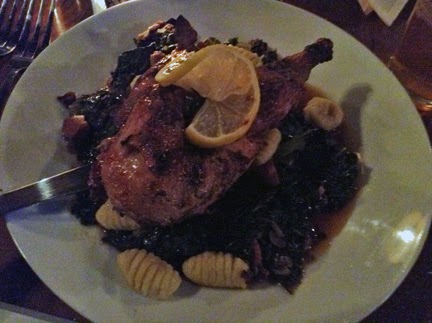 The game hen had piqued my interest because I know this can be a very tasty bird, but the description on the menu--marinated in herbs and dry vermouth and served with spinach gnocchi and tossed with braised kale and bacon--made this sound inventive, unique, and potentially really good, just the kind of dish I like to highlight in my Eat This articles.
