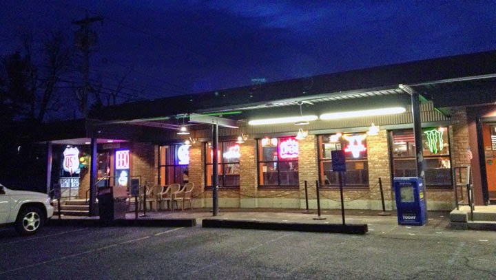 After entering the restaurant, you step ahead to a wide counter at which you order and pick up your order (and to the left there's a frozen custard station, which is super exciting and will be taste-tested on a warmer day this summer). To the right you'll find a seating area with a small bar with a few beers on tap, most notably the QSA Red Ale from Davidson Brothers, which I tried on my second visit. This is a perfectly serviceable, malty, slightly bready ale that was fun to drink from a plastic cup while the DJ behind us spun tunes from the mid-40s to early-60s.